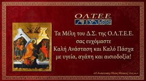Τα Μέλη του ΔΣ της Ο.Λ.Τ.Ε.Ε. σας ευχόμαστε Καλή Ανάσταση και Καλό Πάσχα με υγεία, αγάπη και αισιοδοξία !